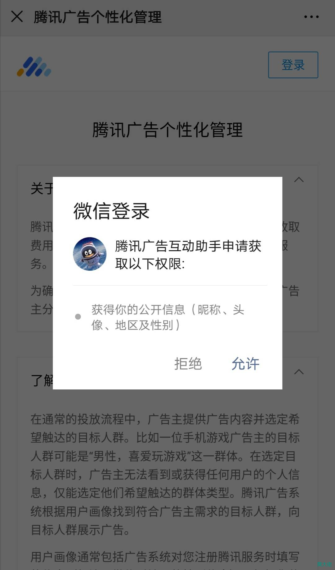 打开《腾讯广告个性化管理》后,右上角有个登录按钮。