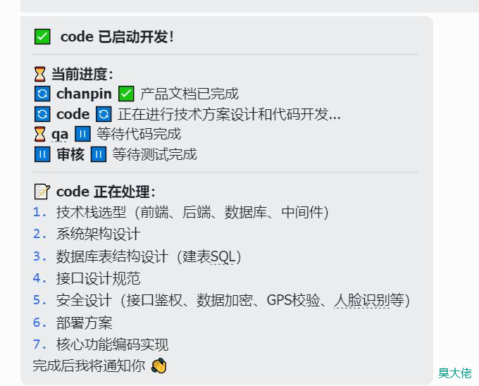- **code**(开发Agent):技术方案、编码实现、接口开发、页面开发